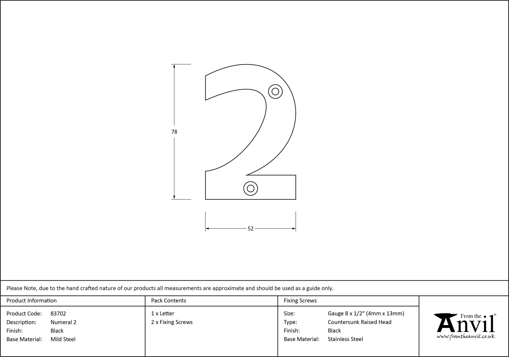Upgrade your space with the Black Numeral in a refined 2 finish. Our simplistic, weighty numerals will add the finishing touch to any entrance door. Sold in singles and supplied with matching SS wood screws.