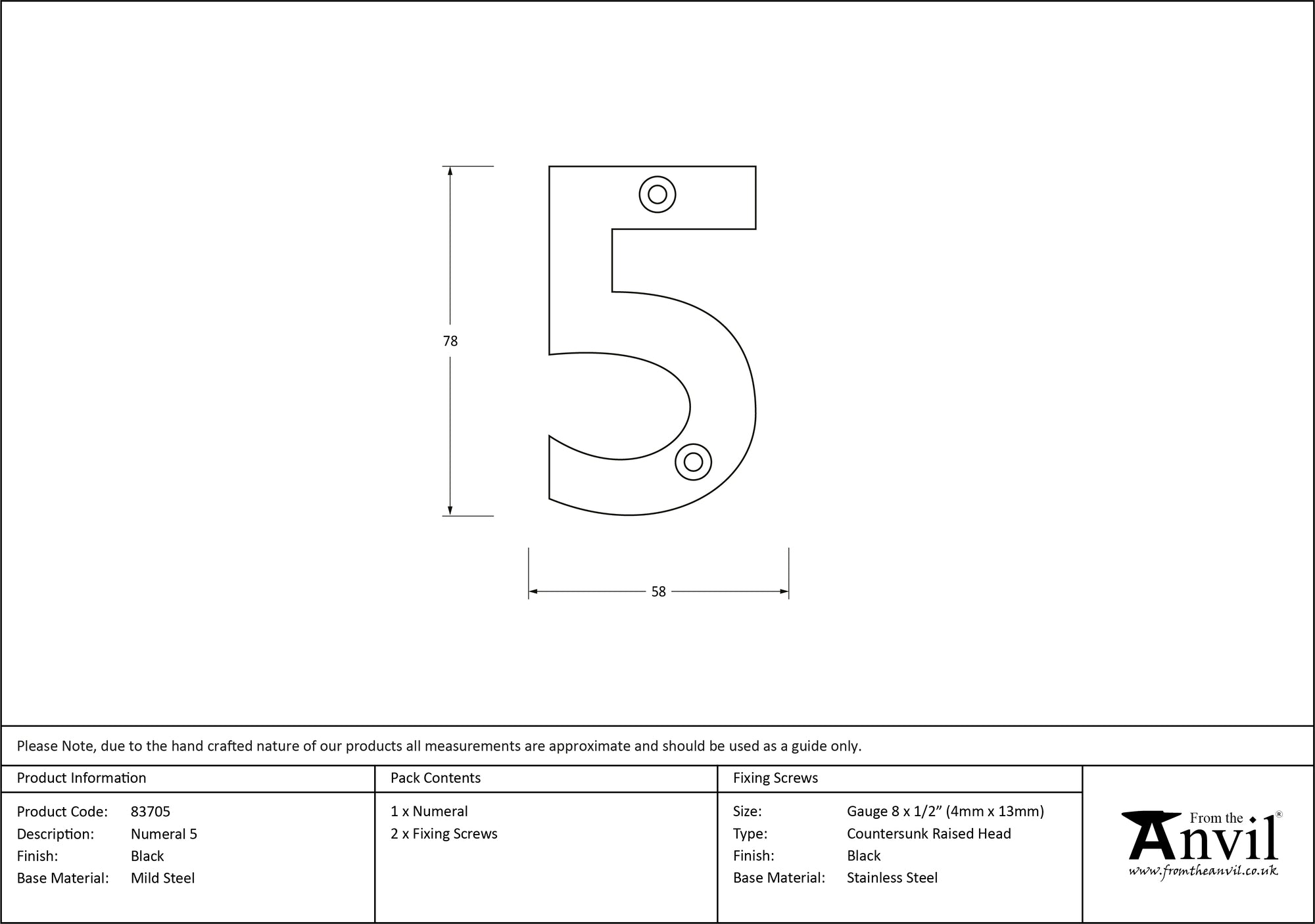 The Black Numeral in 5 finish offers a simplistic and weighty design, perfect for adding a finishing touch to any entrance door. Sold individually, each numeral is supplied with matching SS wood screws.