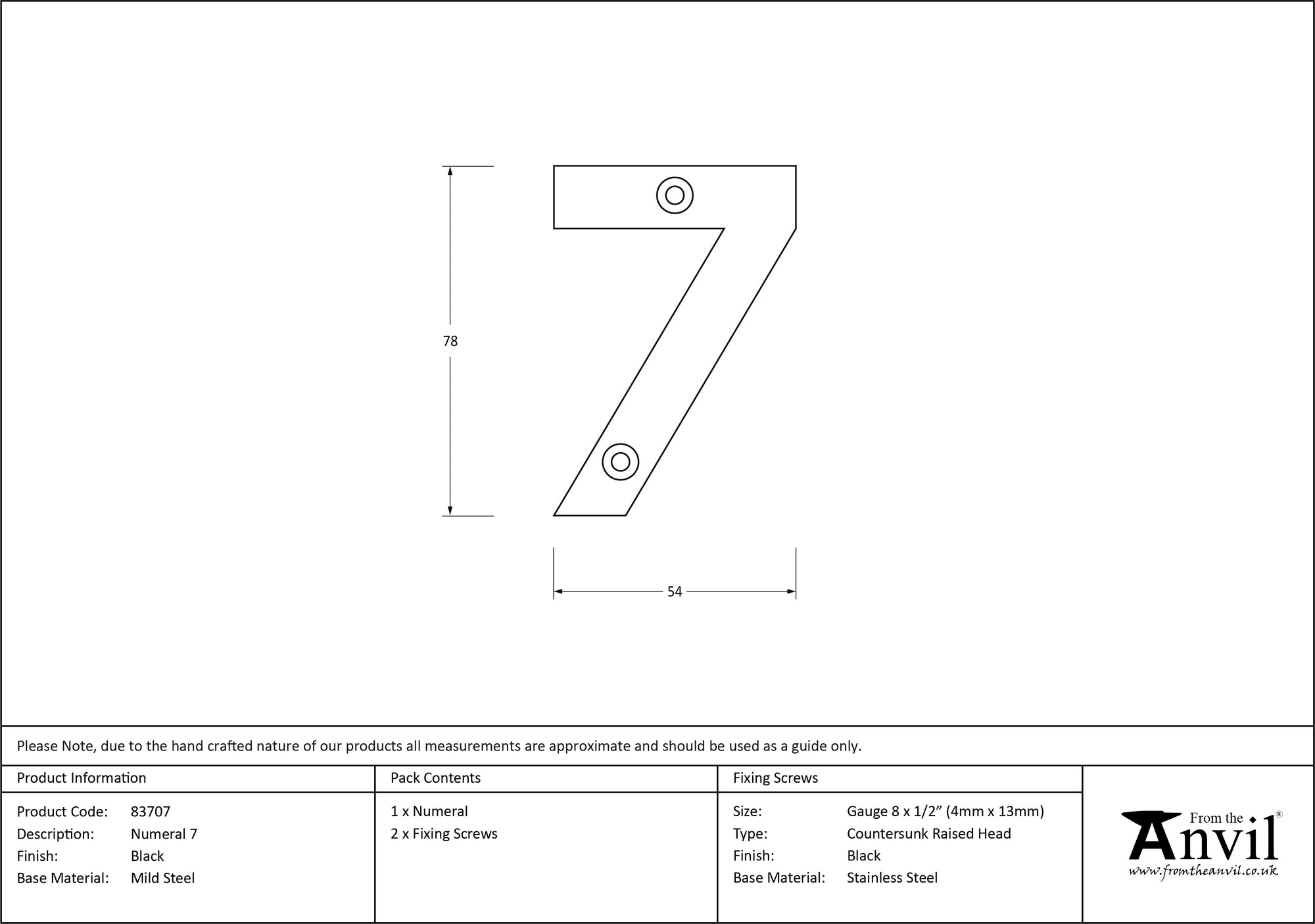 Explore the elegance of the Black Numeral in the stylish 7 tone. Our simplistic, weighty numerals will add the finishing touch to any entrance door. Sold in singles and supplied with matching SS wood screws.