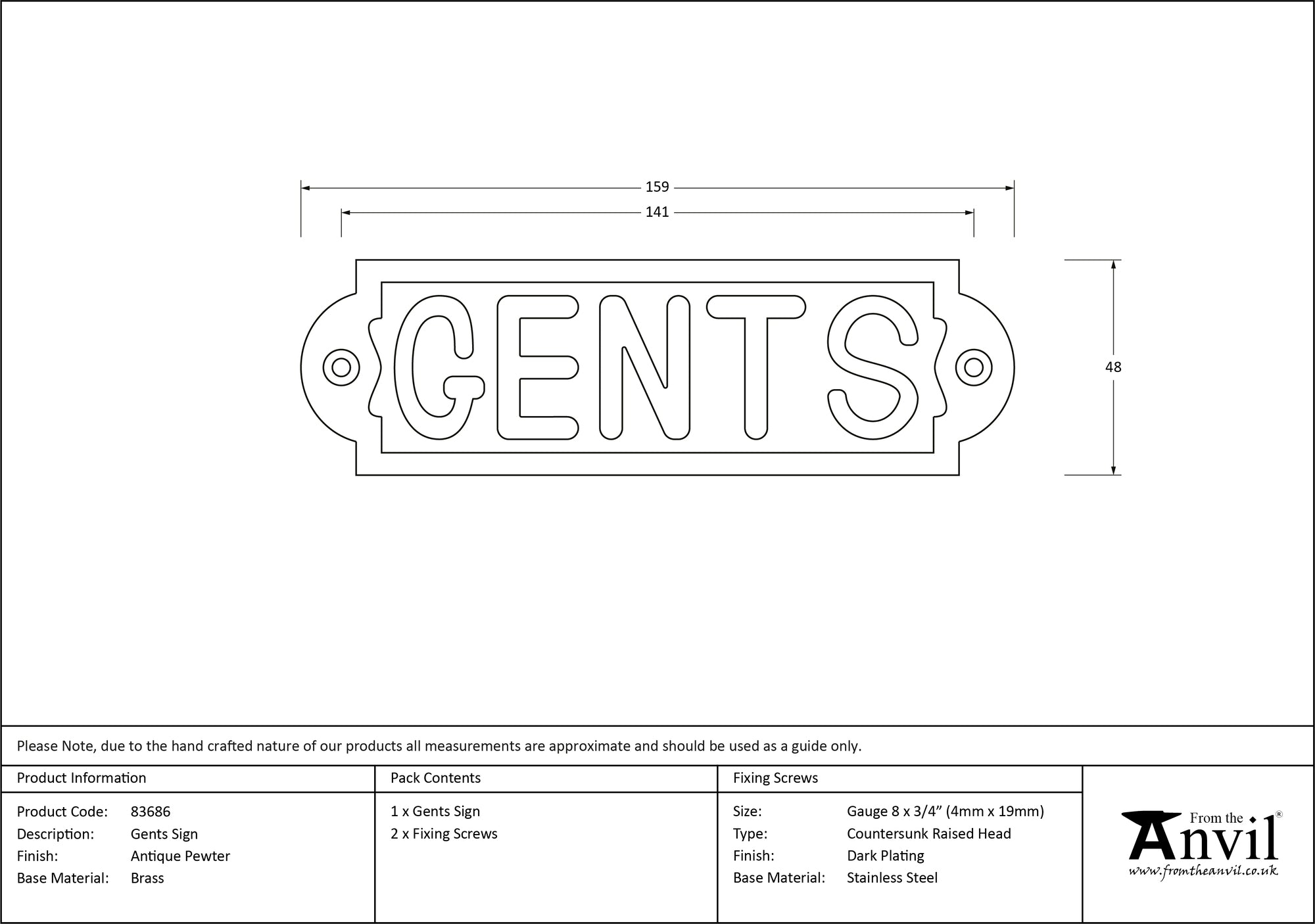 The Gents Sign in Antique Pewter finish offers a stylish and functional addition to both commercial environments such as pubs and restaurants, and residential properties. These signs are sold individually and come with matching SS wood screws for easy installation.