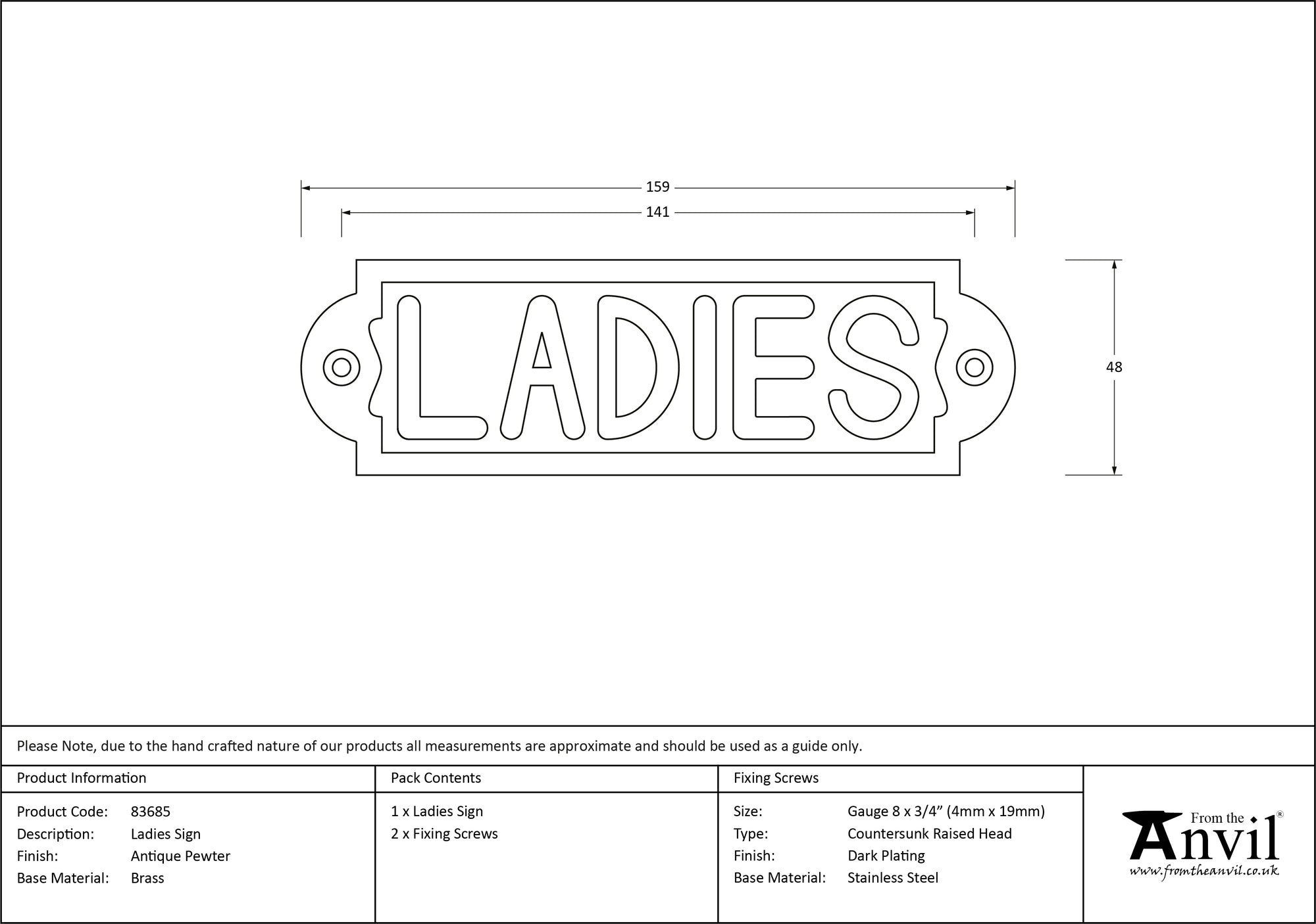 Bring style and performance together with the Ladies Sign in Antique Pewter. This product is perfect for enhancing the aesthetic of commercial environments such as pubs and restaurants, and it can also serve as a charming addition to residential properties.