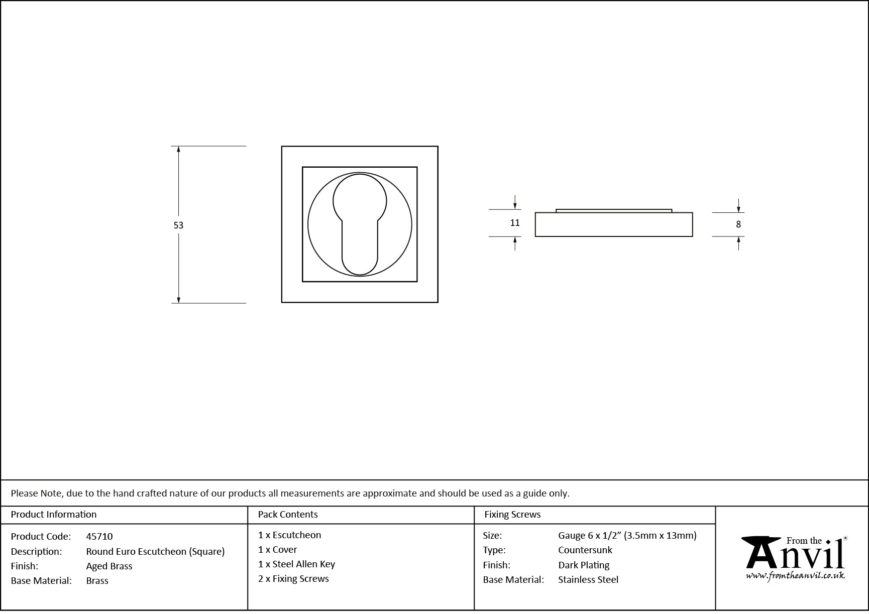 Explore the elegance of the Round Euro Escutcheon - Square in the stylish Aged Brass tone. Our vast range of escutcheons are designed as a finishing touch for all locking doors and are used to decorate key holes. This concealed escutcheon features a simple square cover which adds a contemporary edge to a traditional looking product. Our escutcheons complement all of our mortice knob and lever on rose designs. This escutcheon is used with a Euro profile lock in conjunction with a Euro cylinder. Supplied with matching SS wood screws.