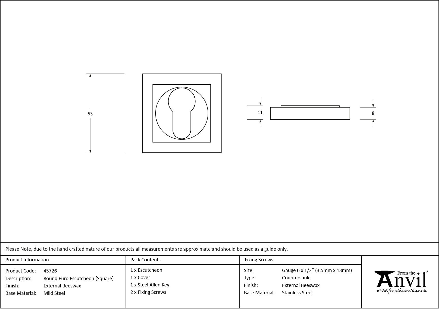 Explore the elegance of the Round Euro Escutcheon - Square in the stylish External Beeswax tone. Our vast range of escutcheons are used to decorate key holes, adding the finishing touch to any locking door. This escutcheon features a Square cover that brings a contemporary edge to a traditional design. Our escutcheons are designed to complement all our mortice knob and lever on rose designs. This escutcheon is used with a Euro profile lock in conjunction with a Euro cylinder. Supplied with matching SS wood screws.