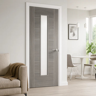 The Grey Laminate Corsica 1 Light Clear Glazed door offers a blend of durability and modern aesthetics, ideal for contemporary interiors. Its light grey laminate finish mimics the elegance of real veneer while ensuring uniformity in colour and texture, making it a low-maintenance choice. The door features a clear glazed vision panel, allowing natural light to filter through, enhancing the sense of space in any room. Designed with 'V' grooves, it adds a subtle touch of sophistication. The 35mm semi-solid core provides a robust feel, ensuring longevity and resilience. Pre-finished for convenience, this door saves you time and effort, making it perfect for both residential and commercial settings. Whether you're updating a living space or fitting out an office, this door combines practicality with style, offering a smart solution for modern interiors.