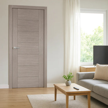 The Light Grey Corsica Prefinished door is a stylish and practical choice for any modern interior. Crafted with a real oak veneer, this door features an attractive V groove design, adding a touch of sophistication to your space. The veneer is impregnated with colour before being fully finished, giving it a unique light grey with a beige tint. This subtle hue is achieved through a specialised staining process, ensuring a consistent and appealing look. Pre-finished with a clear satin lacquer, the door is ready to install straight away, saving you time and effort. Available in a wide range of sizes, it can also be sourced in bespoke dimensions to suit your specific needs. Ideal for a variety of settings, this door combines aesthetic appeal with practical functionality, making it a versatile addition to any home. For those who prioritise colour accuracy, samples and additional imagery are available upon request.