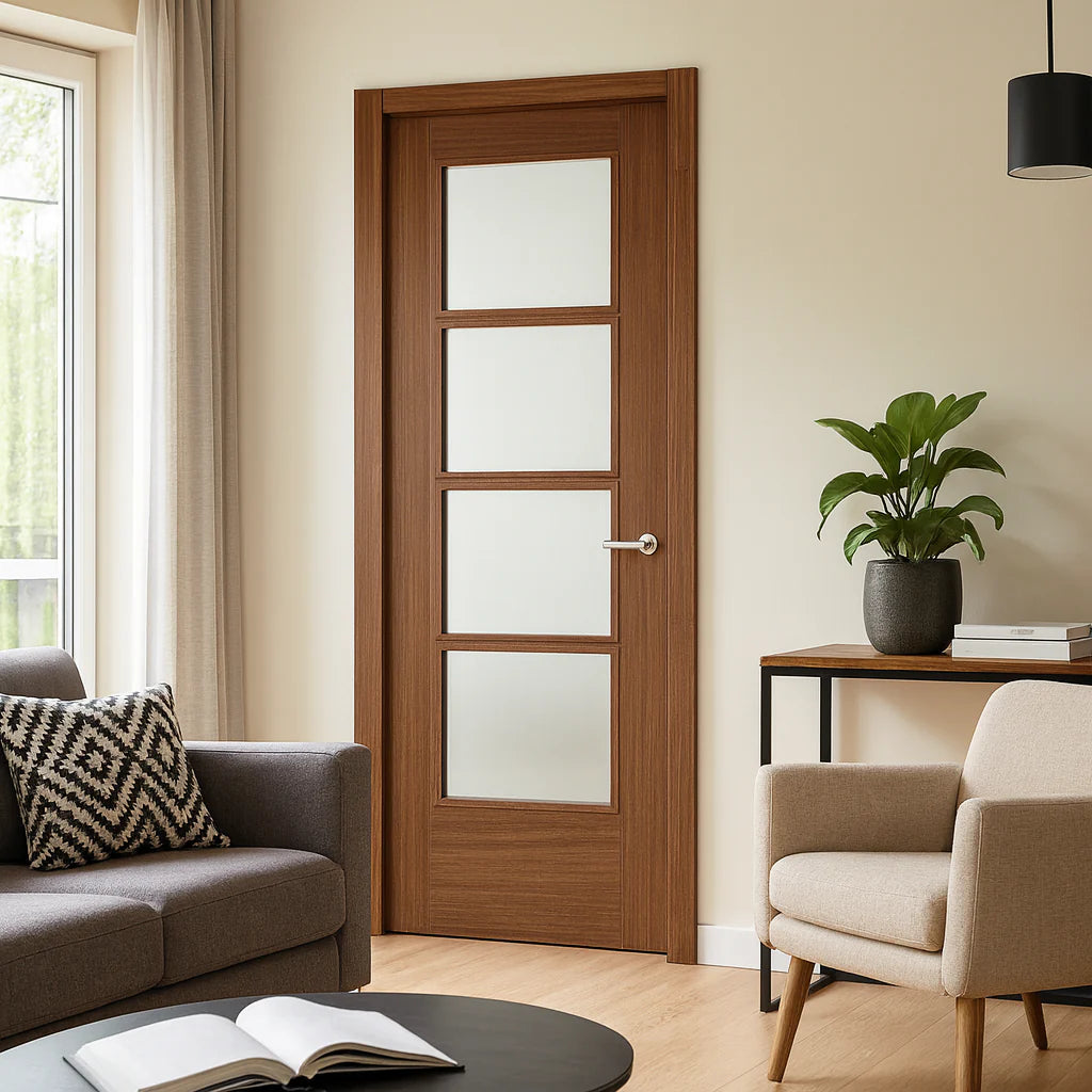 The Walnut ISEO 4 Light Clear Glazed Prefinished door is a stylish and versatile addition to any interior. With its crown-cut walnut veneer and distinctive V grooves, this door offers a sophisticated look that complements a variety of decor styles. The clear glazing in four panels allows natural light to flow through, enhancing the brightness of your space while maintaining a sense of privacy. Pre-finished with a clear satin lacquer, this door is ready for immediate installation, saving you time and effort. The semi-solid core construction ensures durability and sound insulation, making it a practical choice for both homes and offices. Available in a range of standard sizes, the Walnut ISEO can also be custom ordered in bespoke dimensions to fit unique spaces. Whether you choose the standard clear glazing or opt for a bespoke glass option, this door is designed to meet your specific needs with elegance and functionality.