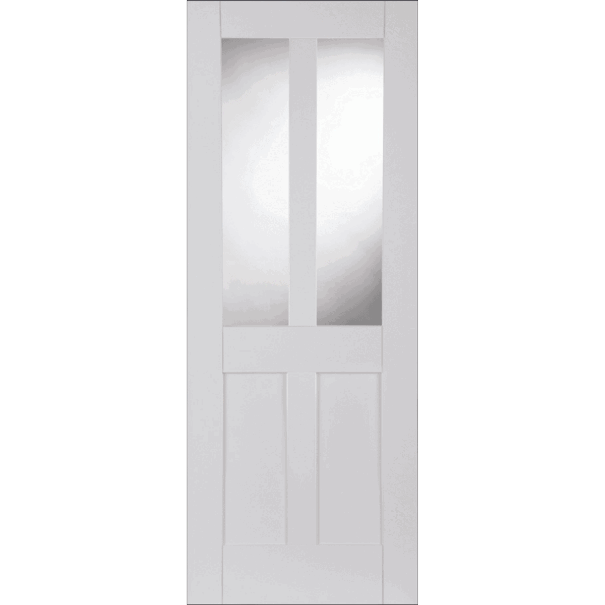 The White Primed Shaker 2 Panel 2 Light Clear Glazed door is a versatile and stylish choice for any interior. It features a classic shaker design with flat panels and distinctive V grooves, offering a clean and modern aesthetic. The door is supplied deluxe primed, requiring only a topcoat for a perfect finish. Its clear glazing allows for ample light flow between rooms, making it ideal for spaces where light sharing is essential. Constructed with a solid 35mm core, this door ensures durability and long-lasting performance. Available in a range of stock sizes, it also offers the flexibility of bespoke sizing to fit unique spaces. Whether used in a contemporary or traditional setting, this door seamlessly complements various interior styles. The glazing options can be customised, adding to its adaptability in diverse environments.