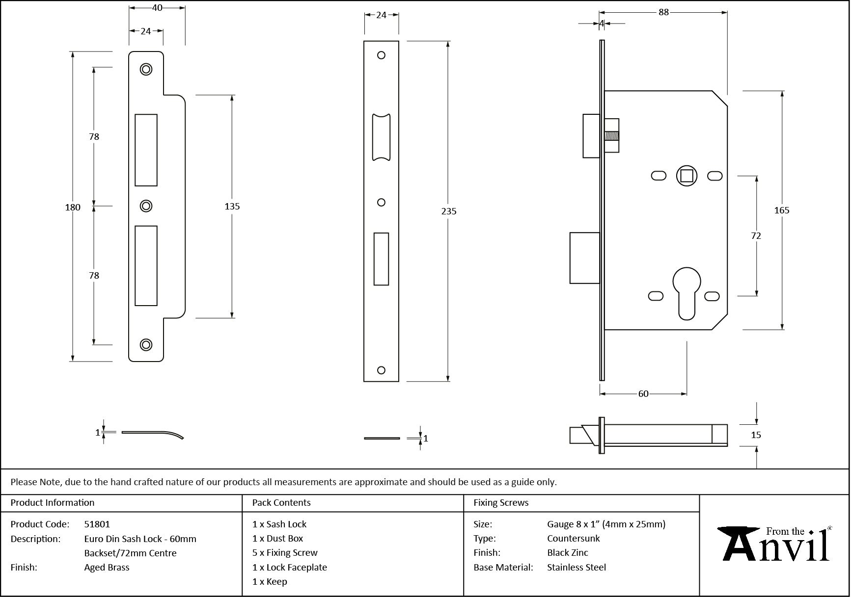 Technical Dimensions | Case Size:165mm x 15mm Case Depth: 88mm Backset: 60mm Centre: 72mm Forend Size: 235mm x 24mm |