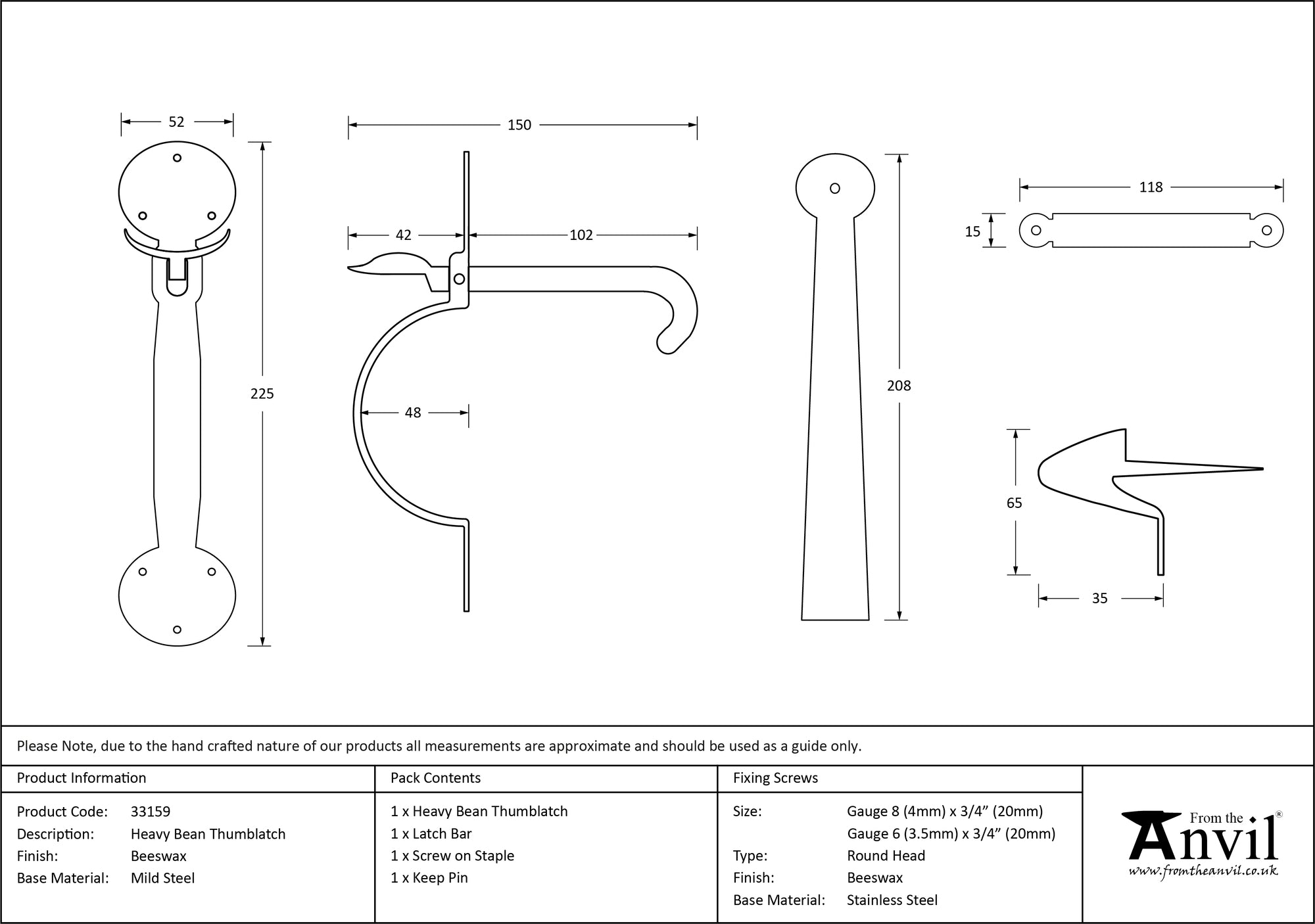 Explore the elegance of the Bean Thumblatch - Heavy in the stylish Beeswax tone. Traditionally used on a ledge and braced door, this thumb latch set includes a decorative door latch with a thumb-shaped lever. By pressing down the lever, it operates a thumb bar that passes through the door, lifting the latch bar on the opposite side to allow the door to open. Our blacksmith thumblatches are expertly crafted from mild steel, shaped using an anvil and fire in a time-honored manufacturing process.