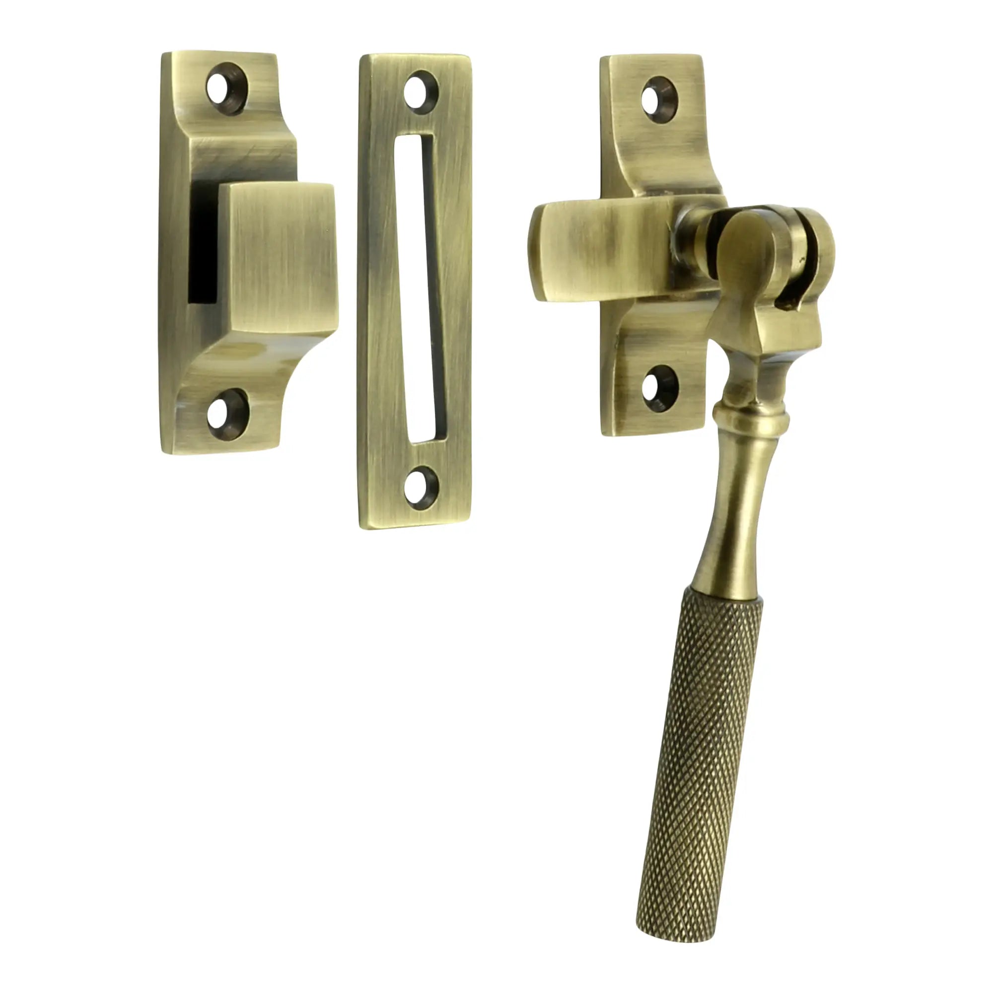The Prima Knurled Casement Fastener combines functionality with a touch of elegance. Crafted from solid brass, this fastener showcases a beautiful antique brass finish that adds character to any window. The knurled handle provides a secure grip, making it easy to operate. Supplied complete with a hook and mortice keep plates, this fastener is designed for both durability and style. Its dimensions of 105mm x 30mm ensure a perfect fit for various applications, while the unique finish may vary slightly, adding to its charm. Upgrade your home's hardware with this exquisite piece.
