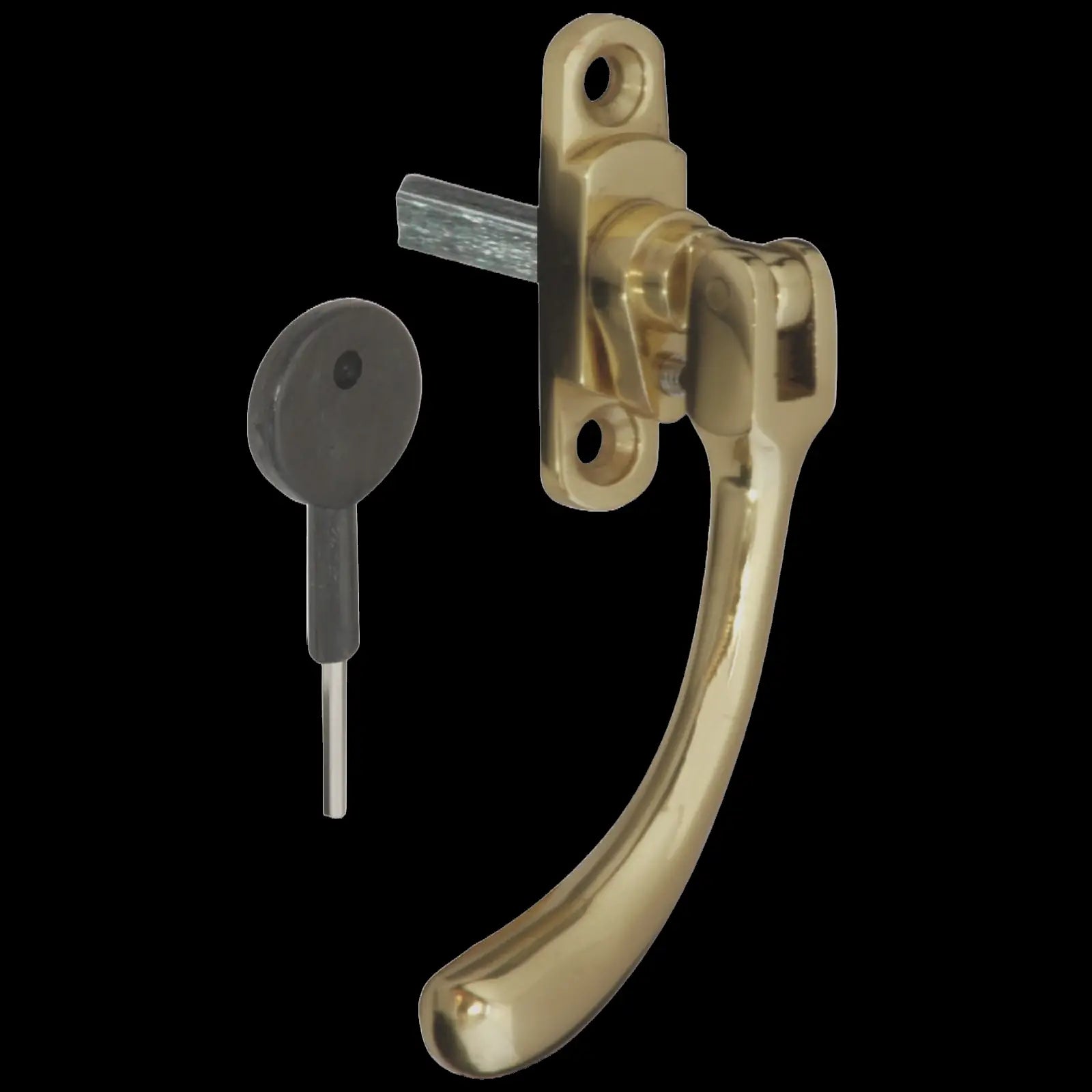 Enhance your window security with the Prima Locking Window Espagnolette, crafted from polished brass for a timeless appeal. This left-hand model features a smooth handle and a robust locking mechanism, ensuring both style and safety. The high-quality lacquer finish guarantees long-lasting shine, making it a perfect choice for modern and traditional settings alike. With precise dimensions, including a 90mm handle and a back plate measuring 58mm x 16mm, installation is straightforward. Each unit comes complete with a locking key, providing peace of mind for your home.