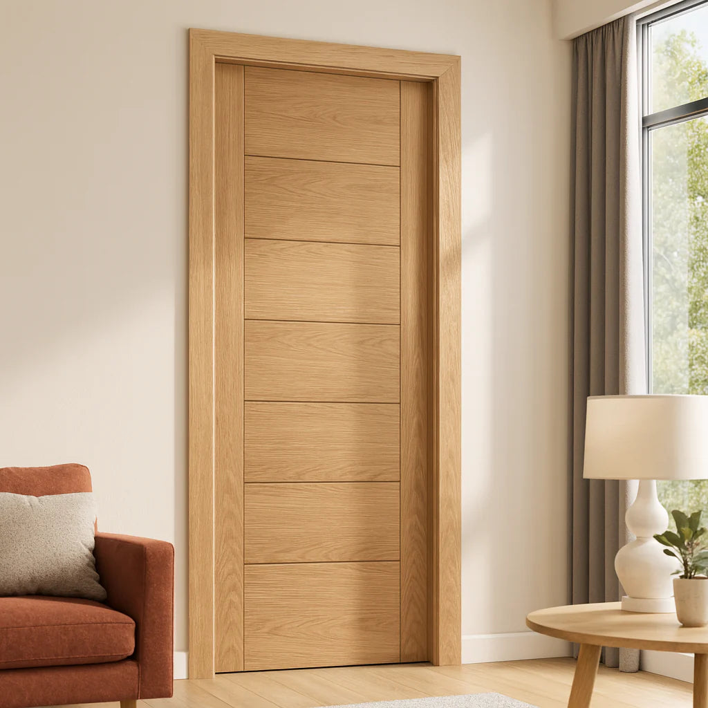 The Oak Corsica Prefinished door is a modern masterpiece, designed to enhance any interior with its sleek aesthetics and practicality. Crafted with a decorative crown-cut veneer, this door features distinctive V grooves that add a touch of elegance to its contemporary style. The prefinished surface, completed with a clear satin lacquer, ensures a smooth and durable finish, saving you the hassle of additional treatment. Its oak construction not only provides robustness but also brings a warm, natural look to your space. This door is perfect for homeowners seeking to upgrade their interiors with a fresh and stylish element. Compatible with various settings, it seamlessly fits into both traditional and modern environments, offering versatility and timeless appeal. Whether for a living room, bedroom, or office, the Oak Corsica Prefinished door is an ideal choice for those looking to make a lasting impression.
