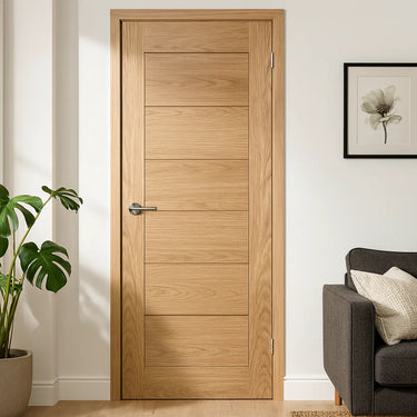 The Oak Corsica Prefinished door is a striking addition to any modern interior. Crafted with a decorative crown-cut veneer, it showcases a natural oak finish that exudes elegance and sophistication. The door features distinctive V grooves that add a touch of contemporary flair, making it an ideal choice for those seeking a stylish yet functional design. Pre-finished with a clear satin lacquer, this door offers a smooth, durable surface that requires no additional finishing, saving you time and effort. Its versatile design makes it suitable for a variety of settings, whether you're updating a living space or enhancing a professional office environment. The Oak Corsica Prefinished door seamlessly combines aesthetic appeal with practicality, ensuring it not only looks impressive but also withstands everyday use. With its modern style and quality finish, this door is a perfect fit for those looking to elevate their interior décor.