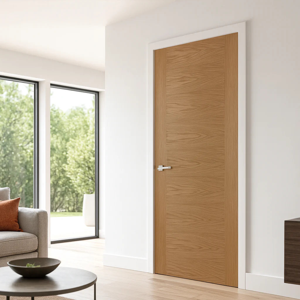 The Oak ISEO Crown Cut Prefinished door is a stylish and cost-effective choice for those seeking a designer touch. This door features a decorative crown-cut oak veneer, offering a sophisticated appearance that mimics the Deluxe Iseo design. Its semi-solid core ensures durability and a substantial feel, making it suitable for various interior settings. The open pore finish adds a natural texture, enhancing the door's elegant look. Pre-finished with a clear satin lacquer, this door is ready for immediate installation, saving you time and effort. Its warm oak tones and clean lines make it versatile, fitting seamlessly into both traditional and contemporary interiors. Ideal for living rooms, bedrooms, or offices, this door provides an attractive and practical solution for enhancing your space.