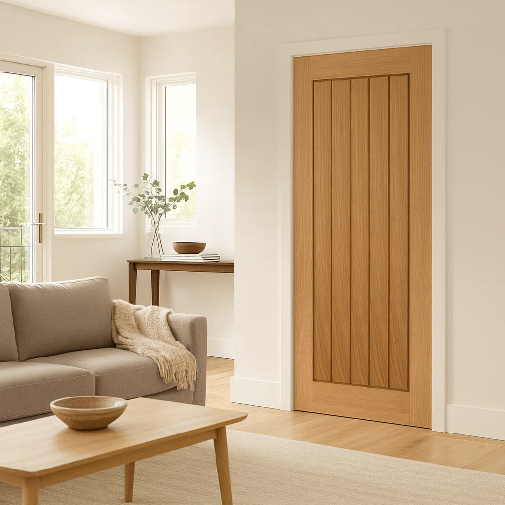 The Oak Mexicano Prefinished door is a stylish and practical choice for any home. Crafted from high-quality oak, this door offers both durability and timeless appeal. Its prefinished surface means it arrives ready to install, saving you time and effort on additional treatments. The design features a distinctive vertical panel layout, enhancing its modern yet classic look. This door is perfect for both traditional and contemporary interiors, adding a touch of elegance and warmth to any room. Its robust construction ensures it will stand up to daily use, making it ideal for busy household areas like kitchens, living rooms, and bedrooms. The Oak Mexicano Prefinished door seamlessly integrates with a variety of interior styles, offering versatility and compatibility with existing decor. Its beautiful oak finish not only enhances its aesthetic appeal but also provides a protective layer, ensuring longevity and resistance to wear. Choose this door for a hassle-free installation and a sophisticated addition to your home.