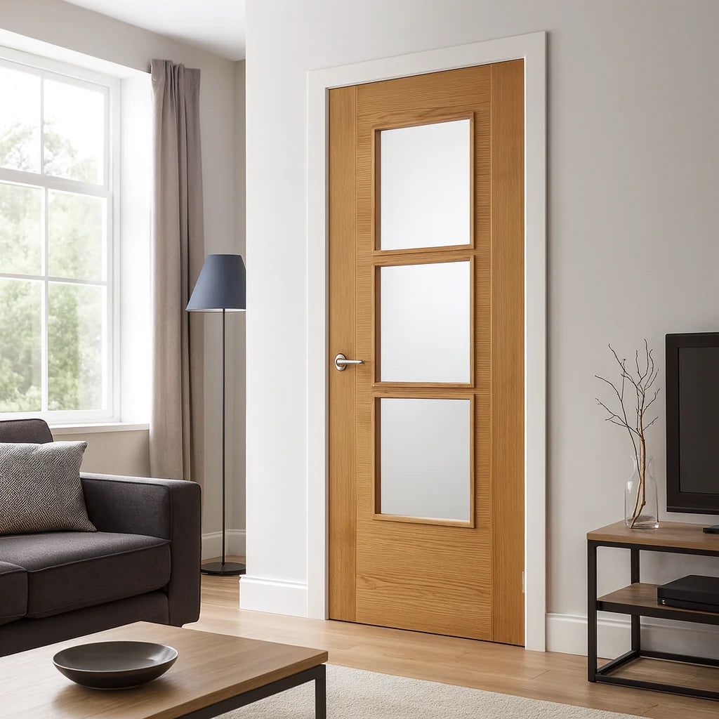 The Oak Mirage 3 Light Clear Glazed Prefinished door is a stunning addition to any interior space, offering both elegance and functionality. Its completely flush design is enhanced by an Ash Inlay, providing a subtle yet distinctive feature that sets it apart. Finished with a clear satin lacquer, this door is not only visually appealing but also ready for immediate installation, saving you time and effort. The three clear glazed panels allow natural light to flow through, creating a bright and inviting atmosphere in your home. Ideal for living rooms, dining areas, or any space where you wish to maintain an open feel while enjoying the privacy of a separated room. The door’s oak finish complements a range of interior styles, from modern to traditional. Additionally, bespoke glazing options are available, allowing you to customise the door to fit your exact needs and preferences.