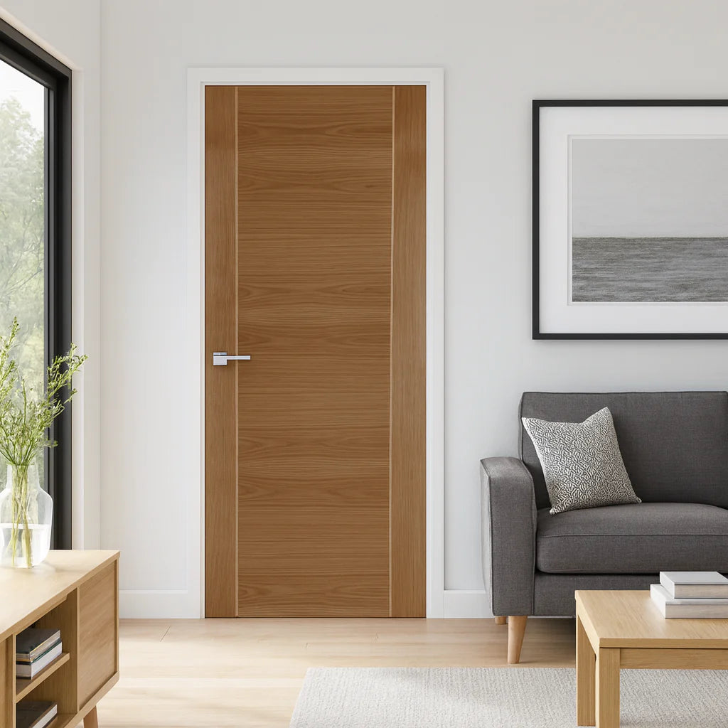 The Oak Mirage Prefinished door is a remarkable blend of style and functionality, perfect for enhancing any interior space. Its completely flush design is accentuated by a subtle Ash Inlay, which adds a touch of elegance and sophistication. Pre-finished with a clear satin lacquer, this door offers a sleek and polished appearance, reducing the need for additional finishing. The oak veneer provides a warm and natural look, making it an ideal choice for both modern and traditional settings. Its durable construction ensures longevity, while the prefinished surface means it's ready to install straight away, saving you time and effort. This door is versatile and can seamlessly fit into various rooms, from living areas to bedrooms, providing a cohesive and stylish aesthetic throughout your home. Its compatibility with a range of door frames and hardware options makes it a practical choice for any renovation or new build project.
