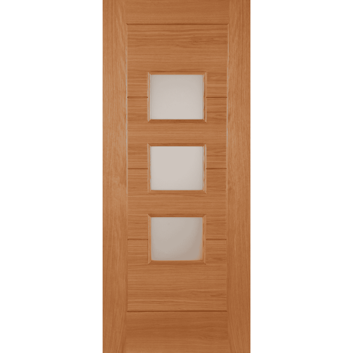 The Oak Monza Acid Glass door offers a contemporary touch with its sleek oak veneer and modern design. Featuring three glazed apertures, this external door combines style and functionality. The frosted glazing allows natural light to filter through while ensuring privacy, making it ideal for any entrance where both illumination and discretion are desired. Supplied unfinished, the Oak Monza provides flexibility for on-site finishing, allowing you to customise the door to your preferred aesthetic. Its robust construction and elegant appearance make it a versatile choice for modern homes seeking a blend of light and privacy in their entryways.