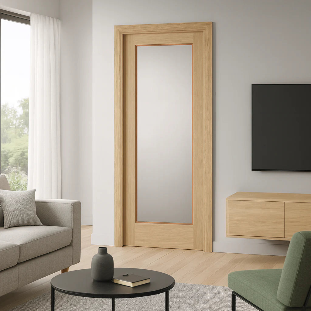 Introducing the Oak Wiltshire 1 Light Clear Glazed Prefinished door, a stunning addition to any home. This door combines the elegance of traditional design with the modern touch of clear glazing, making it ideal for both classic and contemporary interiors. Crafted with precision, it features a solid core for enhanced durability and 10mm solid lippings for a refined finish. The semi-closed pore lacquer not only enhances its natural oak appearance but also provides a layer of protection, ensuring longevity. The clear glazed panel allows natural light to flood through, creating a bright and welcoming atmosphere in any room. Compatible with both residential and commercial settings, this door is versatile and practical. Available in a 35mm thickness with a clear flat glass option, and a glazed FD30 variant upon request, it caters to various safety and aesthetic needs. Elevate your space with this competitive and stylish door choice.