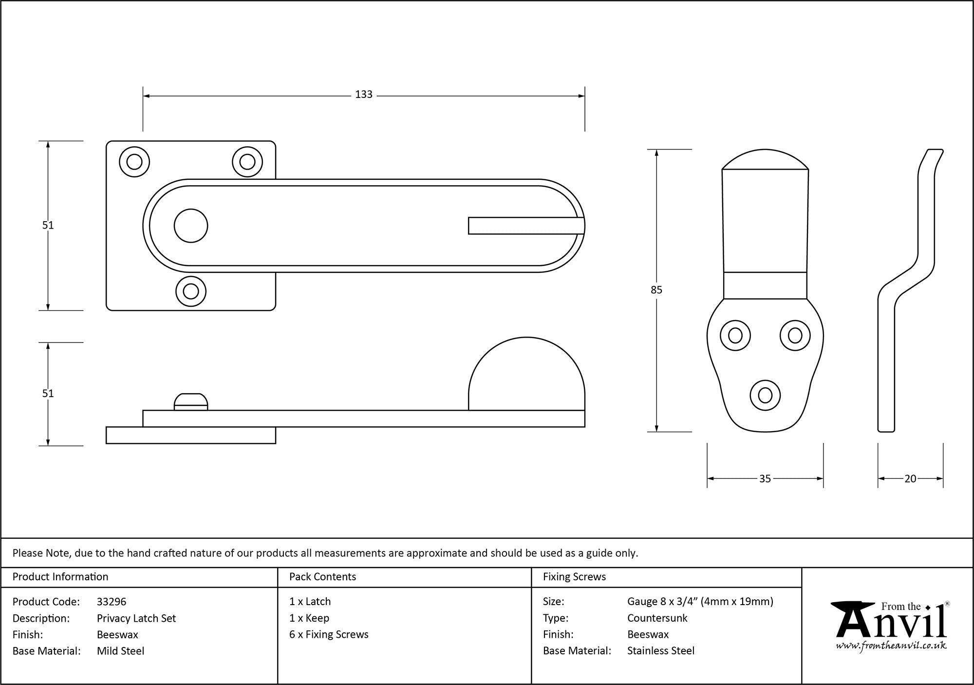 The Privacy Latch Set in Beeswax finish offers a simple fastening option for single side access, perfect for cupboard or wardrobe doors. This hand-forged design features a square fixing plate with rounded ends. The latch bar is restricted by the keep and can be lifted to open the latch. It is a reversible latch suitable for use on both left or right-handed doors. Supplied with matching SS wood screws.